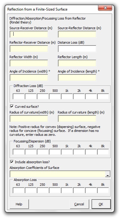 Strutt|Auditorium Acoustics|Reflection from Finite Surface calculates the reflection strength from a finite-sized reflecting surface taking into account the reflector geometry and surface finish.