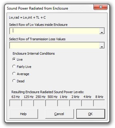 Strutt|Building Acoustics|Enclosure calculates the sound power radiated from an enclosure, given the row of sound power levels (Lw), the row of transmission loss values (TL) and the enclosure conditions, and inserts the results into the active row on the worksheet.