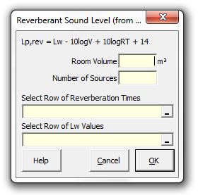 Strutt|Building Acoustics|Reverberant Sound Level (from RT) inserts the reverberant sound pressure level into the active row of the worksheet.