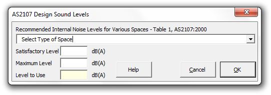 The user selects the type of space - the acceptable range of internal noise levels are then displayed in the dialogue box as sourced from the relevant AS2107 version.