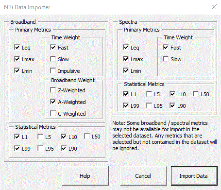 Select the parameters you would like displayed (Note that A-weighted Leq, Lmax and Lmin values are displayed by default). Some of the options in the user form may not be available in the chosen NTi data set and will be ignored if they cannot be found.