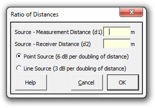Strutt|Propagation|Ratio of Distances, inserts the ratio of distances correction into the current row of the worksheet, to convert a measured sound level at a known distance (`d_1` to a sound level at a given distance `d_2`)