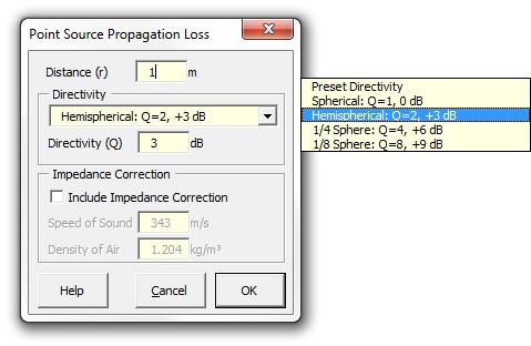 Strutt|Propagation|Point Source provides the correction for spherical sound radiation from a source, given the distance from the source (r) in metres. A directivity index (in dB) is used to allow correction for hemispherical, 1/4 sphere and 1/8 sphere radiation, either directly entered by the user or via the drop-down menu provided.